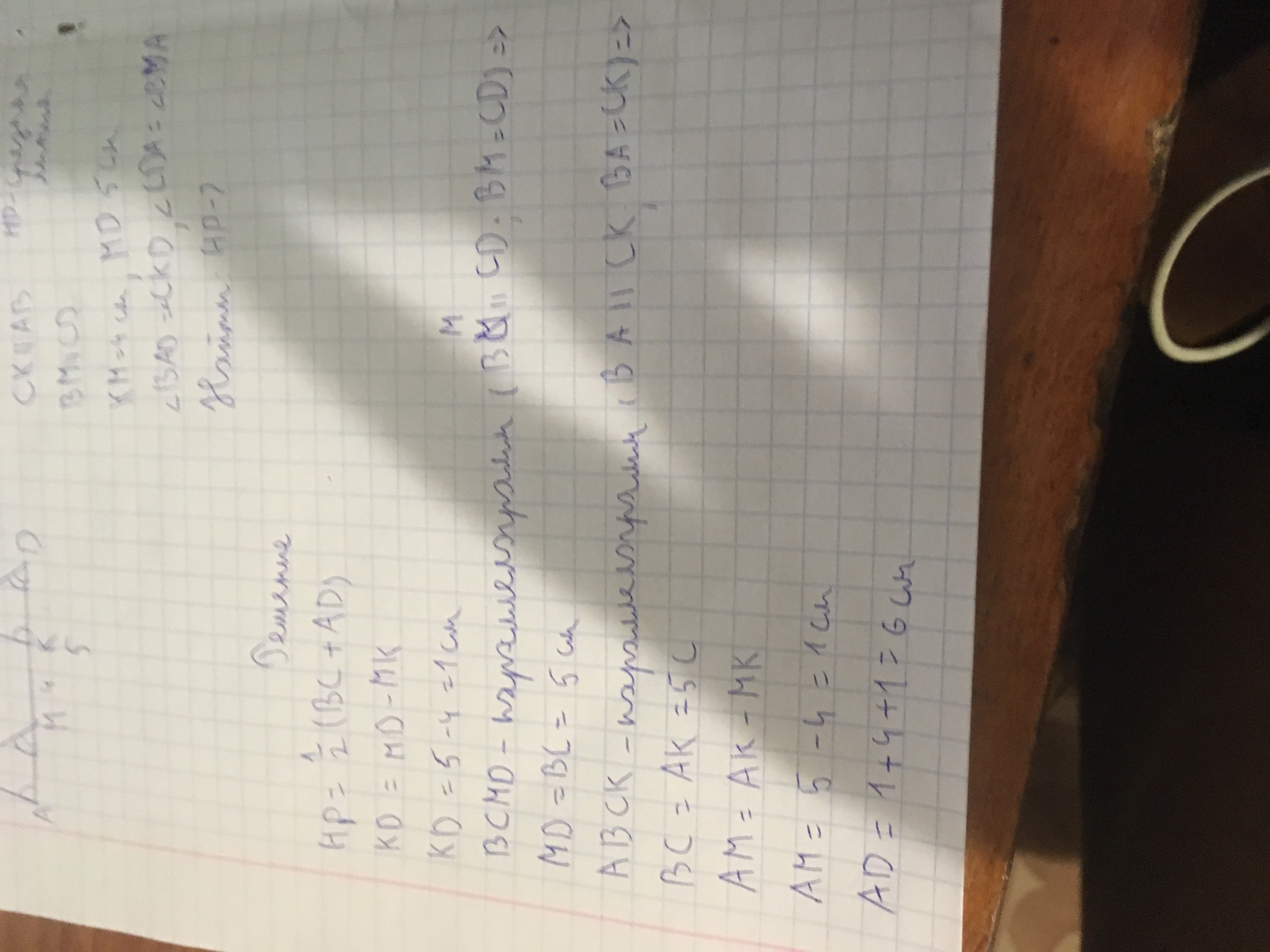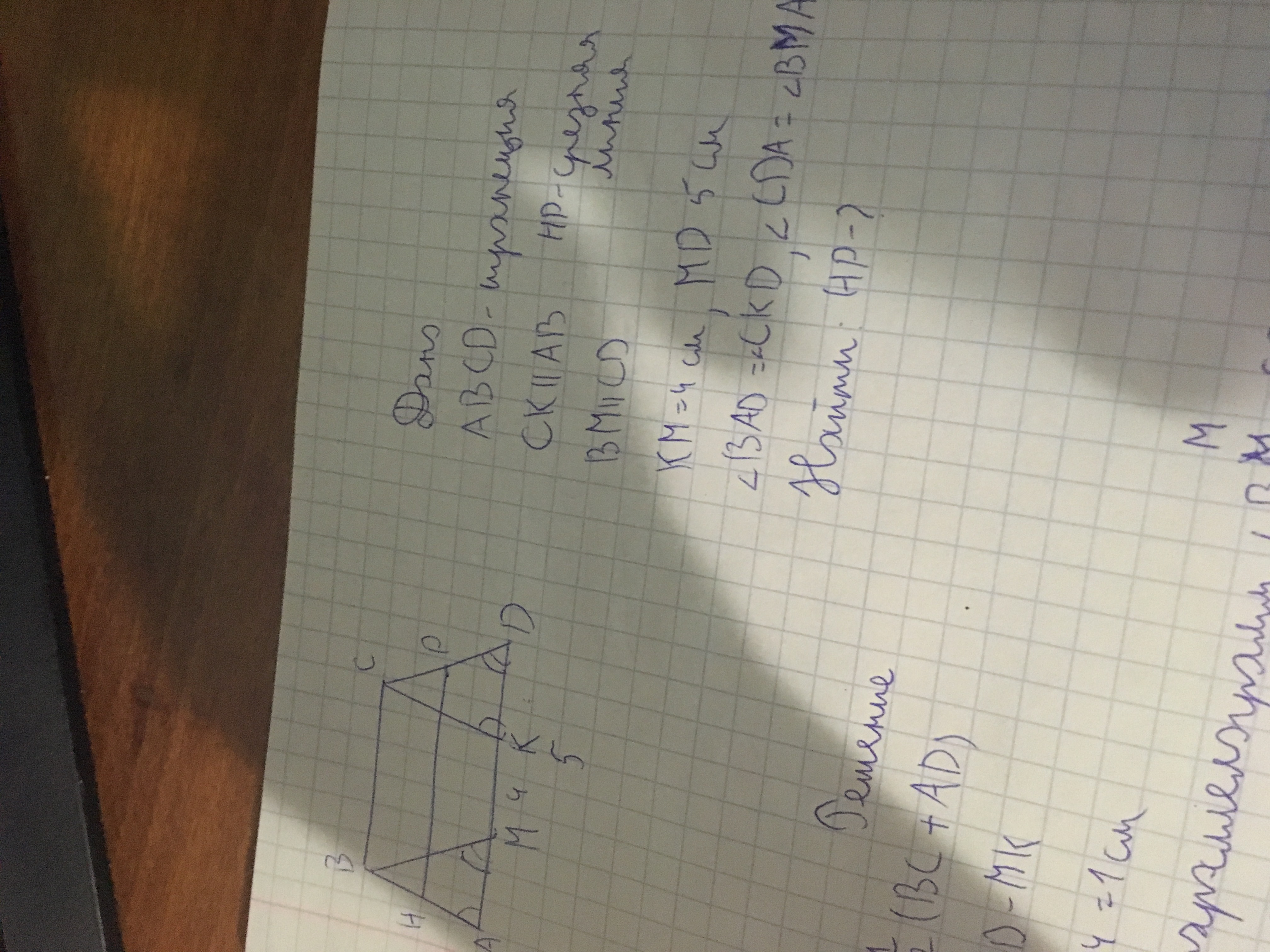 В трапеции АВСD CK||AB, BM||CD. KM=4cm,MD=5cm. Угол BAD равен углу СКD, угол CDA равен углу ВМА. Найдите среднюю линию трапеции