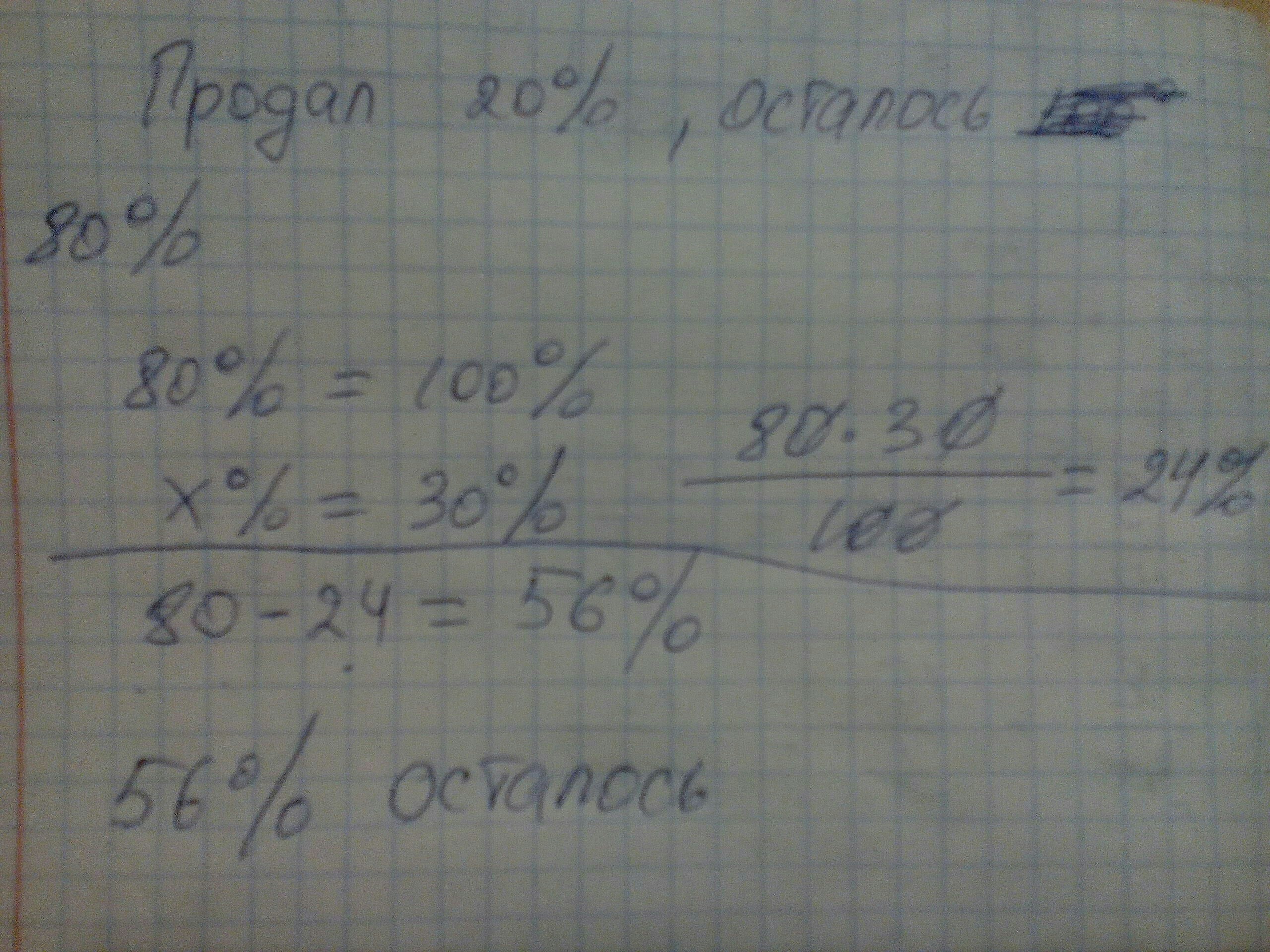 Продавец 20% ткани от рулона продал первому покупателю , 30 % от остатка другому покупателю .Сколько % осталось не продано?