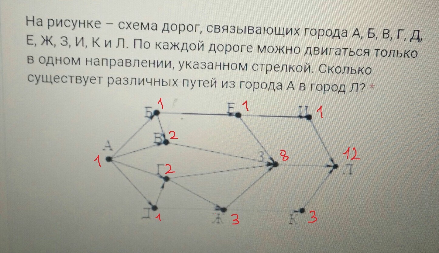 Каждой вершине, начиная с начальной (A), поставим в соответствие индекс, равный количеству путей, которыми можно попасть в эту вершину. Для вершины A (начало пути) индекс всегда равен 1 (в начало пути можно попасть единственным образом – никуда не двигаясь). Теперь сформулируем правило: индекс вершины равен сумме индексов его предков. Исходя из этого индекс Б равен 1 (предок у Б один – вершина A). У вершины В предками являются А и Б, значит индекс вершины В равен 1+1=2. И т.д.
