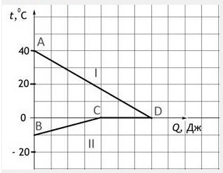 На рисунке представлен процесс теплообмена, когда в нагретую до 40 градусов жидкость погружают кусок льда такой же массы. Потерями тепла при теплообмене можно пренебречь. Выберите и отметьте ДВА верных утверждения.