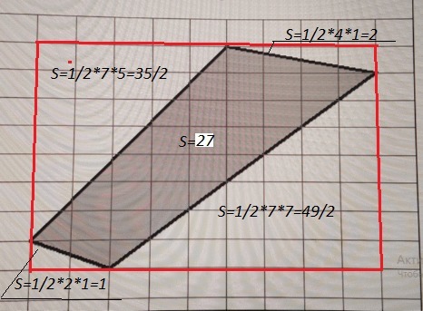 где В - число точек, расположенных в вершинах клеточек внутри фигуры, Г - число точек, расположенных в вершинах клеточек на границе фигуры. Всё! Этой формулы достаточно. Для данного многоугольника В=23, Г=10=> S=23+10:2-1=27 см².