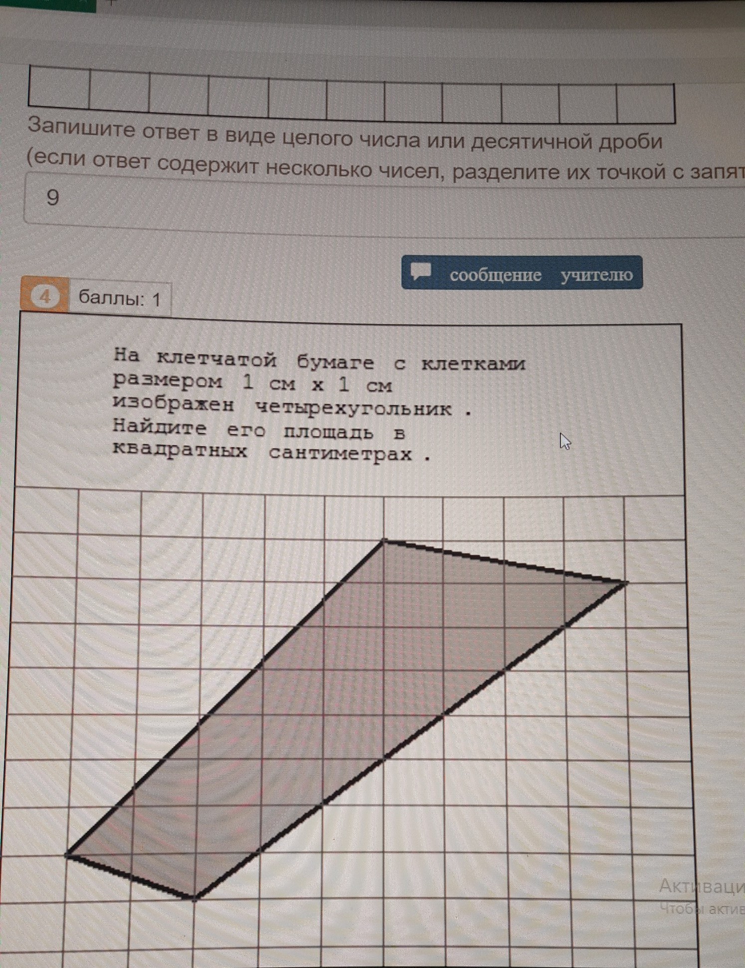 на клетчатой бумаге с клетками размером 1см × 1см изображен четырехугольник. найдите его площадь в квадратных сантиметрах.