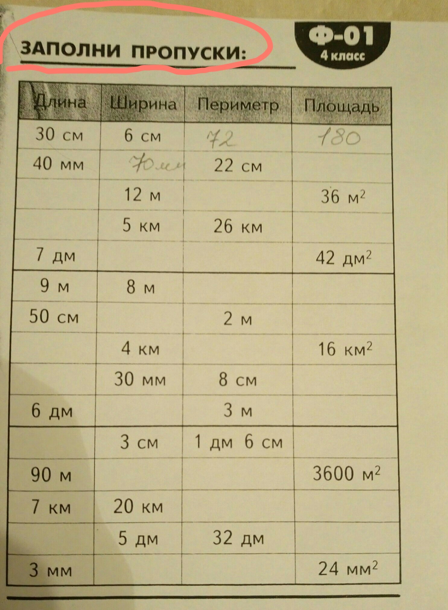 5ая строка : Ширина - 6 дм , Периметр - 30 дм