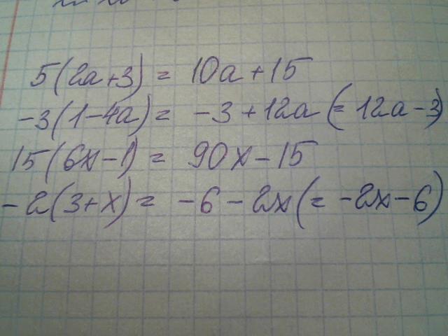 5(2a+3), -3(1-4a),15(6x-1),-2(3+x) раскрыть скобки пж решите после каждой запятой пример срочно!!