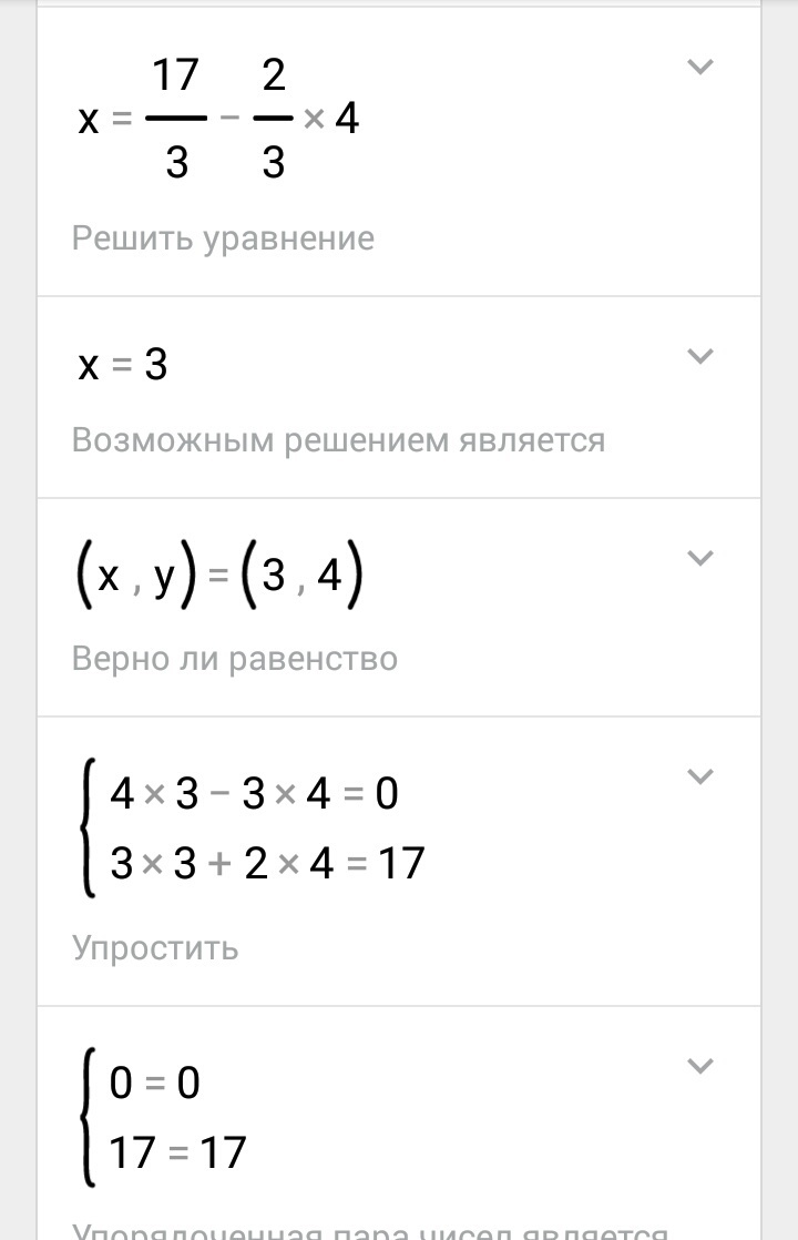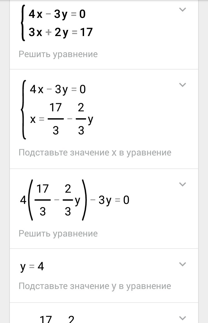Решение системы 4х-3у=0,3х+2у=17 на фото
