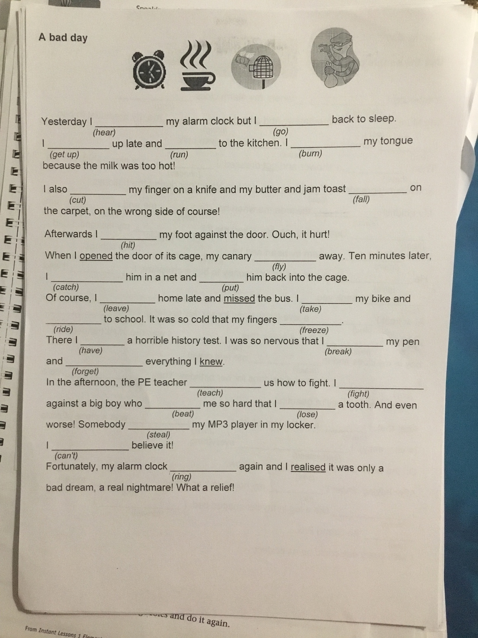 heard,went,got up,ran,burned,cut, felt,hit,flew,caught,put,left,took,rode,freezed,had,broke,forgot,thought,fight,beat,lost,stole,couldn't,rang