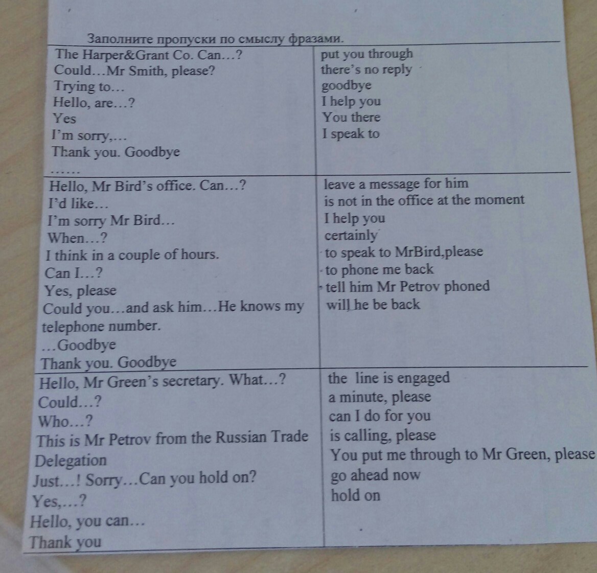 Can I help you? I`d like to speak to Mr Bird, please. ... Mr Bird is not in the office at the moment. When will he be back? Can I leave a message for him? Could you tell him Mr Petrov phoned and ask him to phone me back? Certainly.
