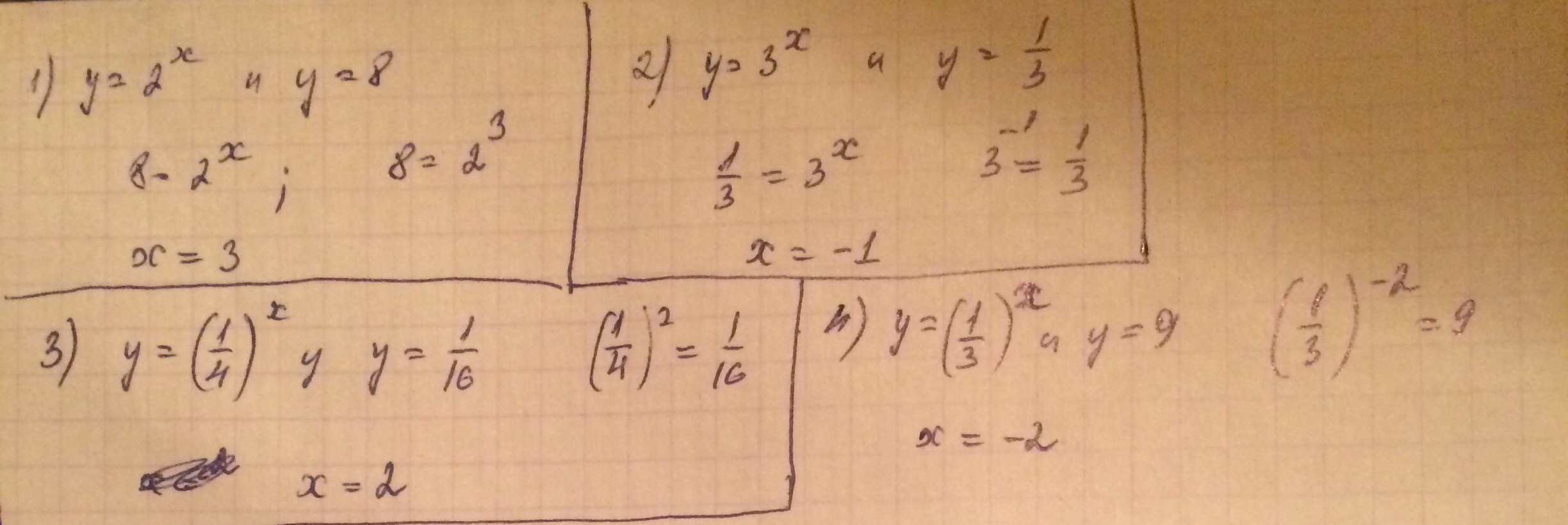 Найти абсциссу точки пересечения графиков функций: 1)y=2^x и y=8; 2)y=3^x и y=1/3; 3)y=(1/4)^x и y=1/16; 4)y=(1/3)^x и y=9.