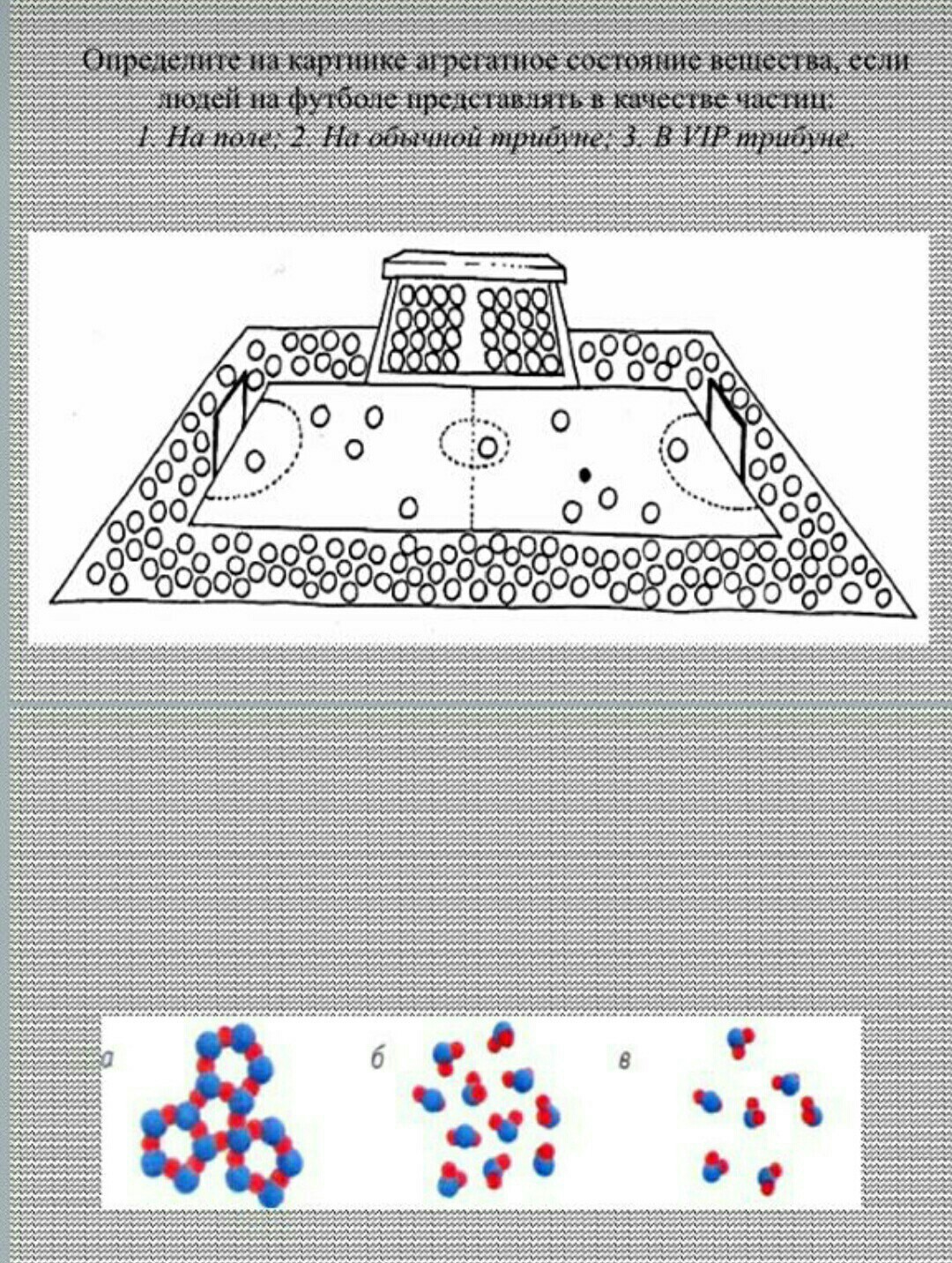 На поле- в(газ) . На обычной трибуне б(жидкость). На вип трибуне а(твёрдое вещество)