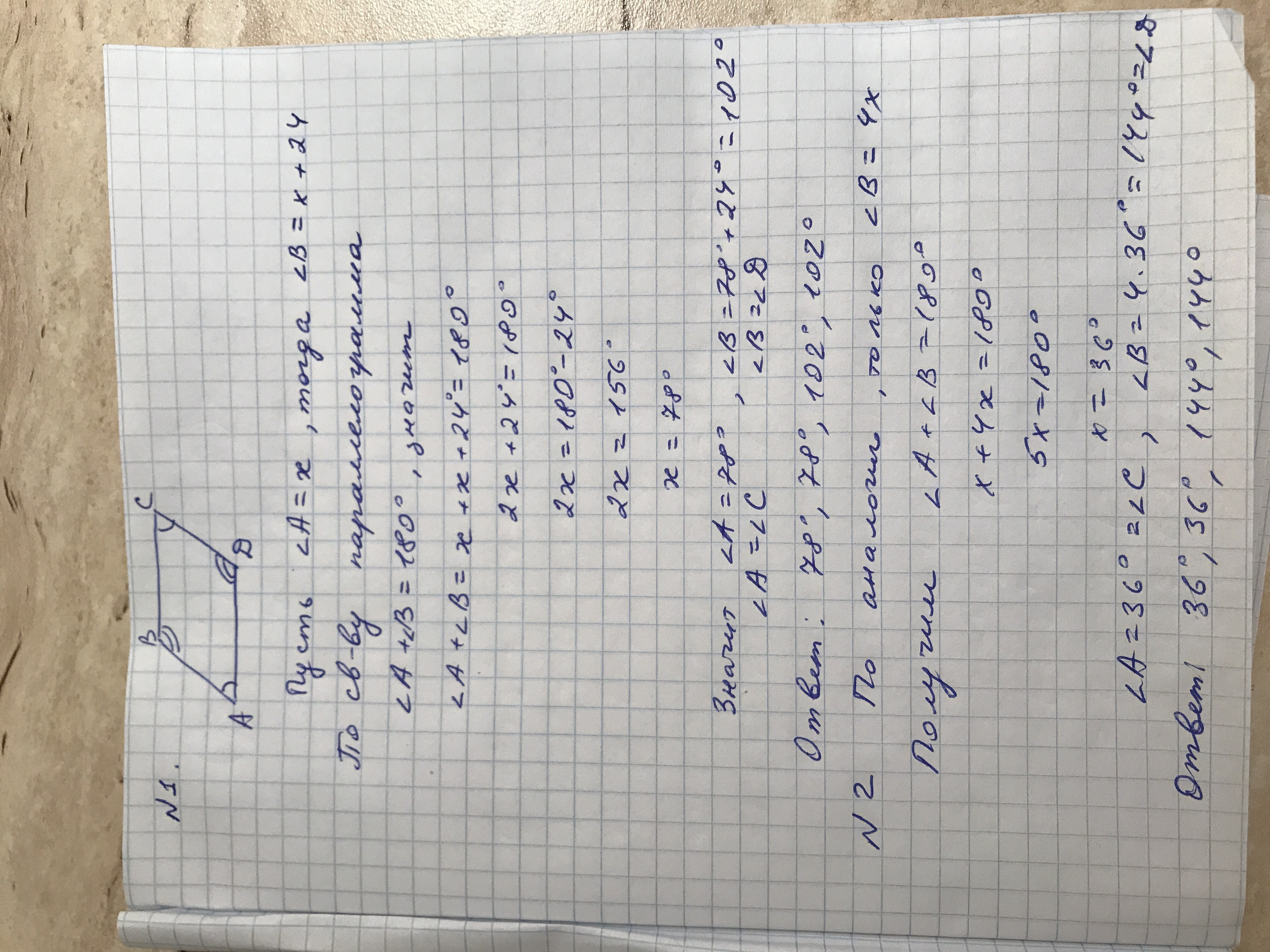 Задача №1. Угол параллелограмма больше другого на 24 градуса. Найти углы параллелограмма.