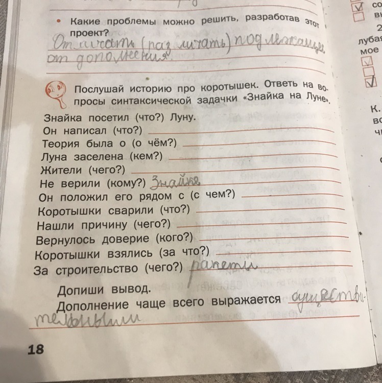 Послушай историю про коротышей. Ответь на вопросы синтаксической задачи Знайка на луне