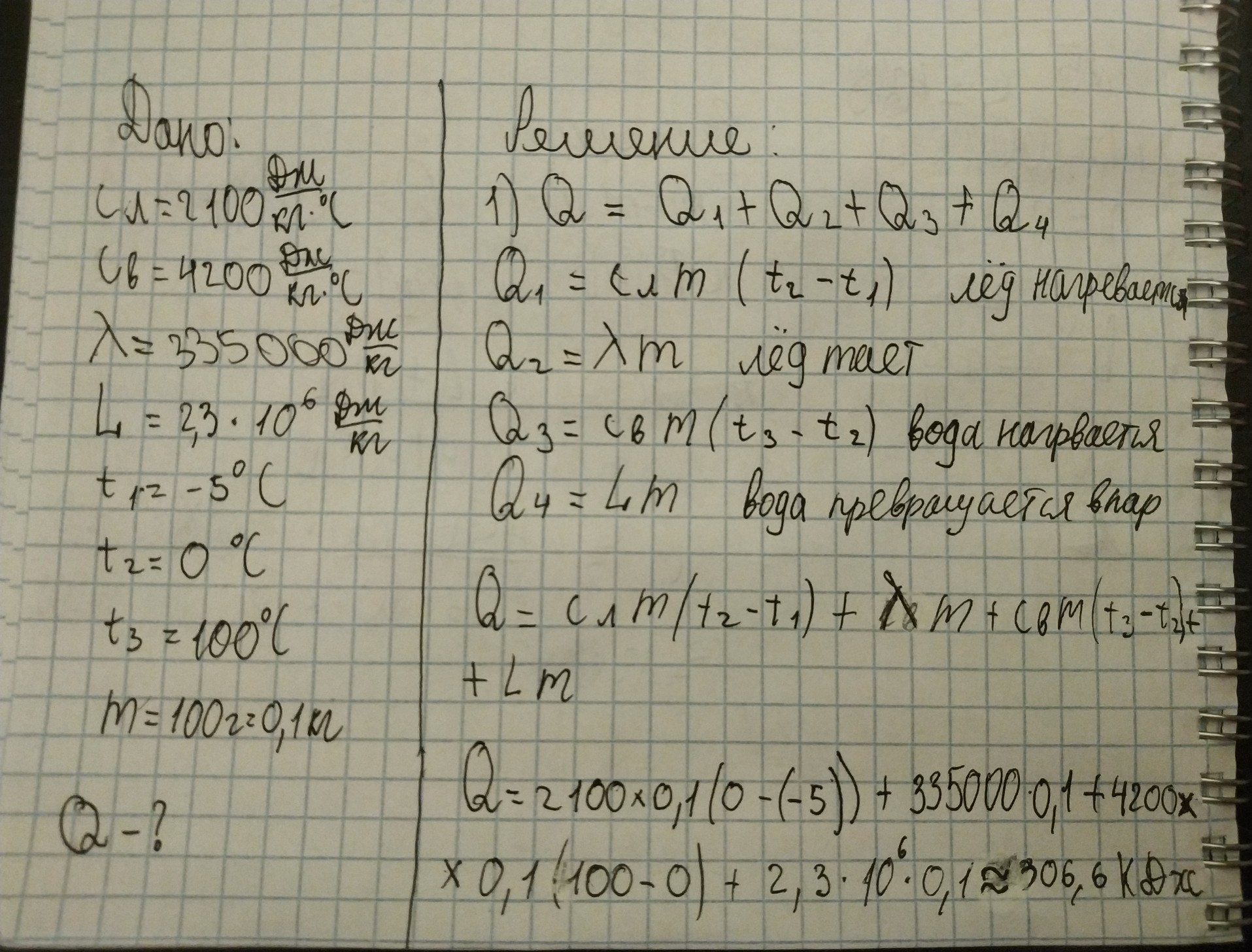 Какое количество теплоты необходимо для обращения в пар 100 г льда, взятого при температуре -5 градусов