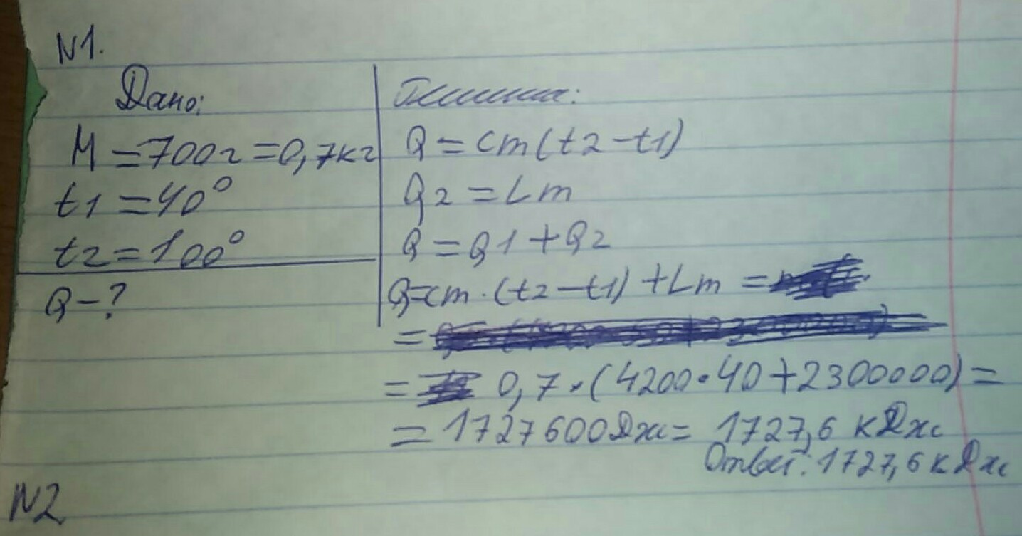 1)Вода массой 700 г. имеющую температуру 40 градусов Цельсия, нагрели до 100 градусов Цельсия и обратили в пар. Сколько энергии прошло на весь процесс?