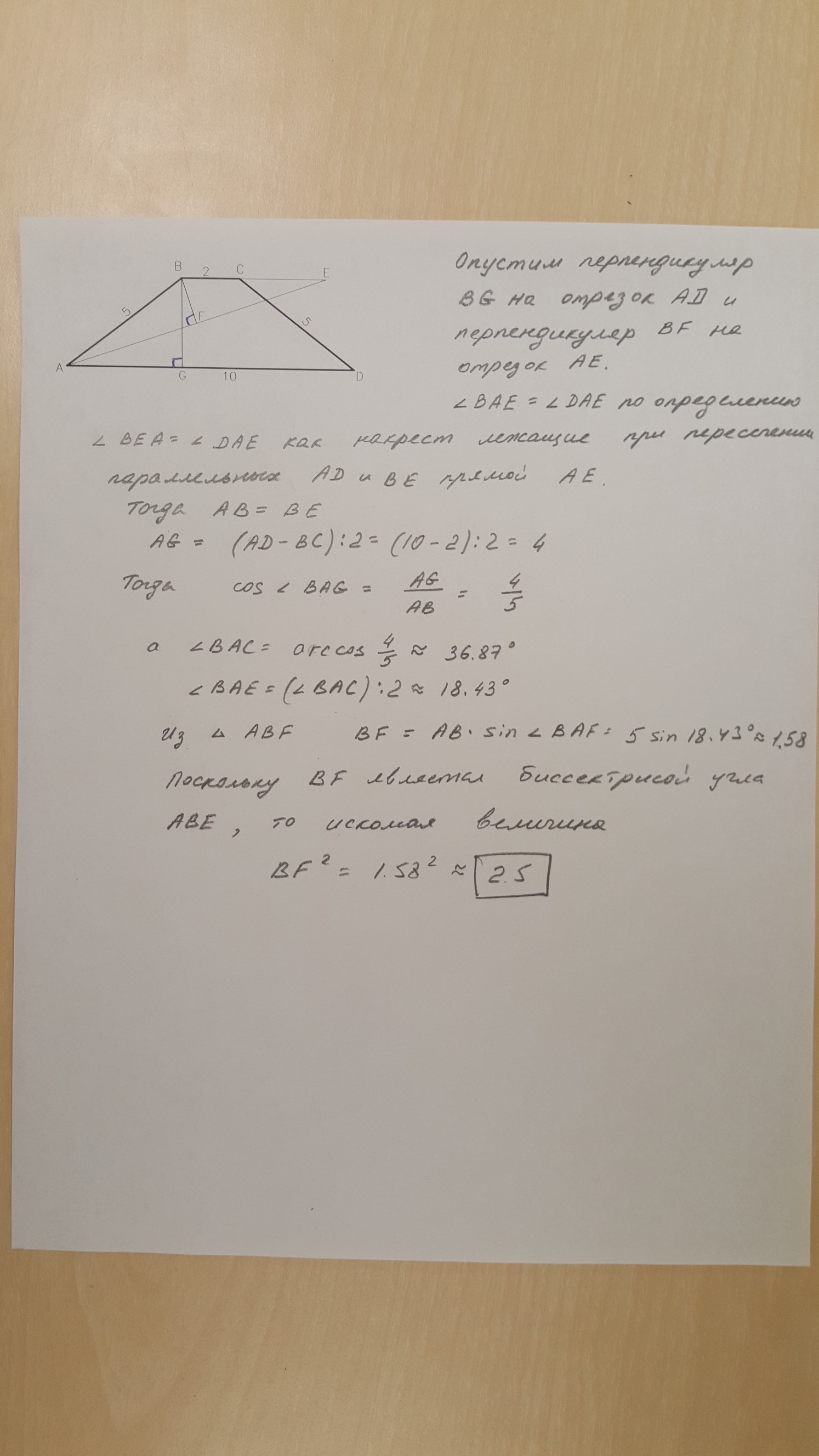В равнобедренной трапеции ABCD основания AD и BC равны 10 см и 2 см соответственно, а боковые стороны AB=CD=5. Биссектриса угла BAD пересекает продолжение основания BC в точке E. Найдите квадрат биссектрисы угла ABE в треугольнике ABE. Ответ выразите в сантиметрах с точностью до одного знака в дробной части числа и введите в поле ответа.