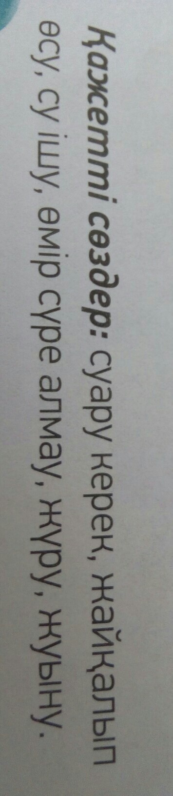 Терезе алдындағы гүлдерді суару керек.Бау-бақшаның жайқалып өсуі үшін атам көп еңбек етті.Таңғы ас ішпес бұрын су ішу керек.Балықтар сусыз өмір сүре алмайды.Кішкентай інімнің жүріп жүргенін көріп мәзбін.Анам жуыну керектігін айтты.