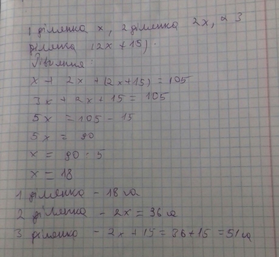 Площа 3-ох ділянок 105 га, площа 1 ділянки у 2 рпзи менша від площі 2, а 3 на 15 га більша від площі 2. Яка площа кодної ділянки?