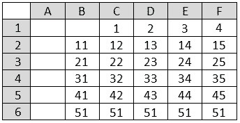В ячейки диапазонов C1:F6 и B2:B6 электронной таблицы записаны числа, как показано на рисунке. В ячейке B1 записали формулу =$E1 + D$3 и скопировали её в одну из ячеек столбца A, при этом значение этой ячейки стало равно 66. В какую ячейку была скопирована формула? В ответе введите номер строки ячейки.