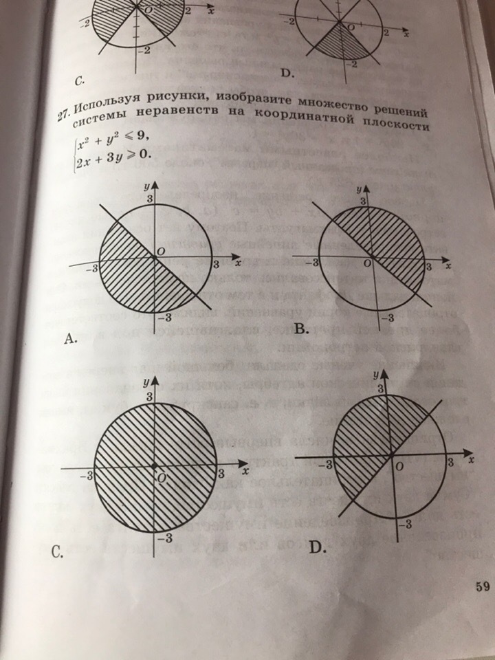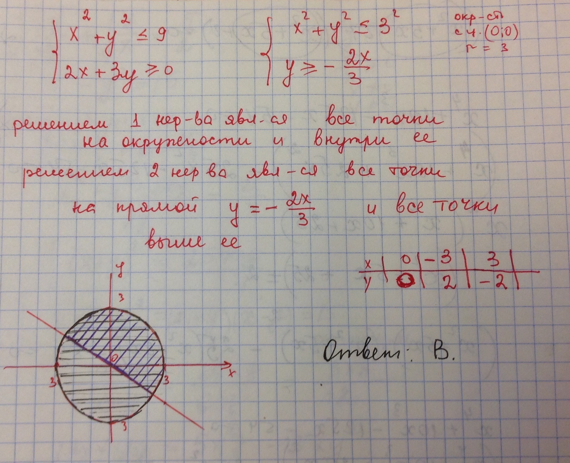 Используя рисунки, изобразите множество решений системы неравенств на координатной плоскости. x^2+y^2≤9 2x+3y≥0