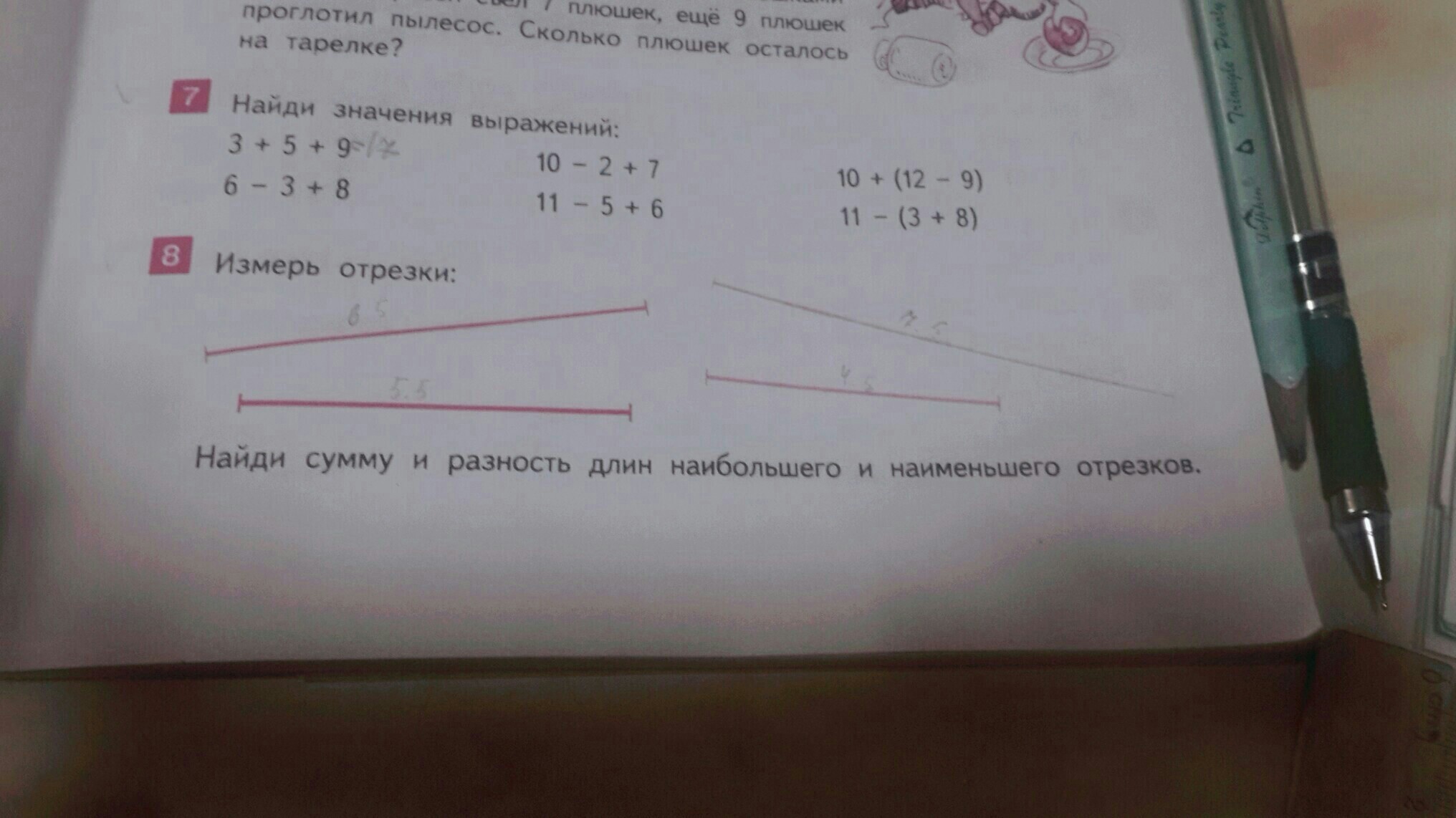 Приставь к отрезкам линеечку. измерь их длину. какой получится длиннее всех, какой получится короче всех. После того, как ты увидишь по линейке, сколько длина у самого большого и самого маленького отрезков, найди их сумму (сложи их длины) и найди разность (вычти из большого маленький)