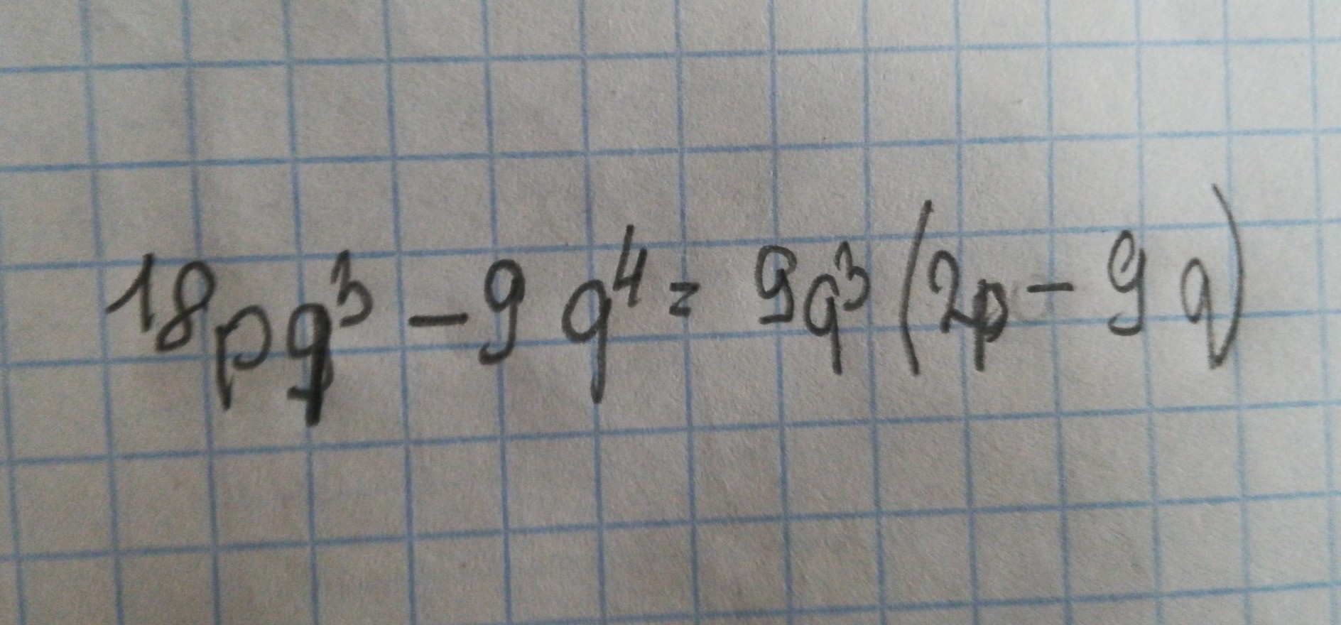 18pq^3-9q^4=9q^3*(2p-q). ^- это степень.