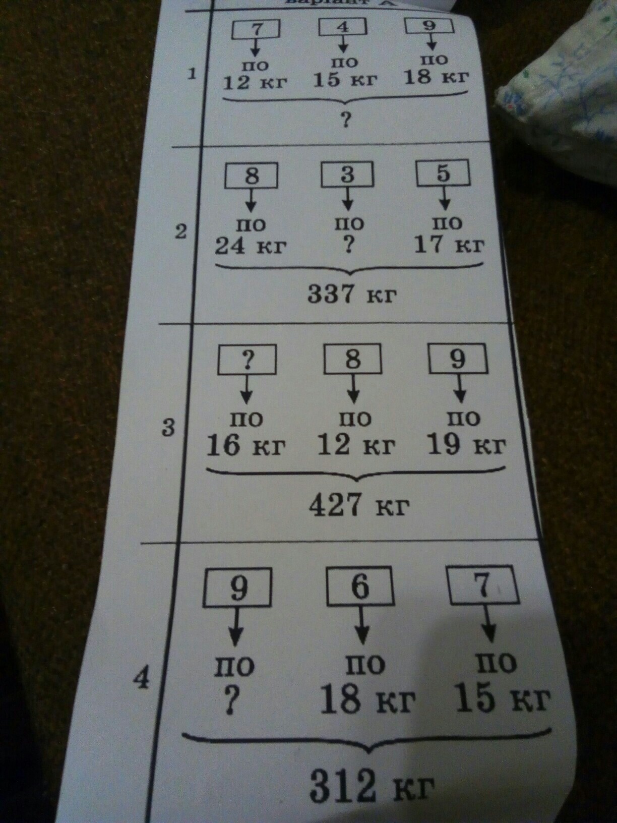 Фермер продал 337 кг овощей: 8 мешков картофеля по 24 кг в каждом, 5 мешков лук по 17 кг в каждом и 3 мешка моркови. Сколько моркови в 1 мешке?