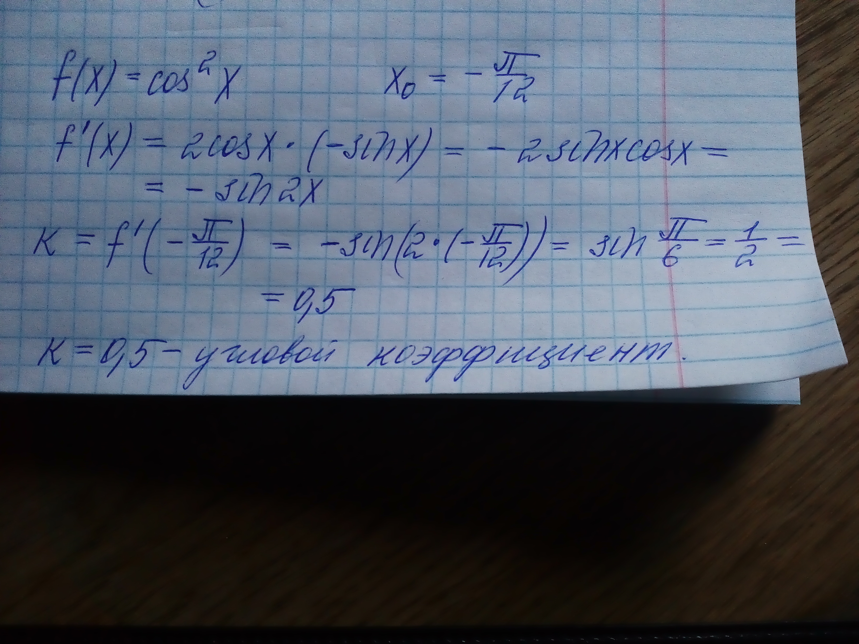 найдите угловой коэффициент касательной к графику функции f(x) в точке х0 ,если f(x)=cos^2 x x0=- пи/12