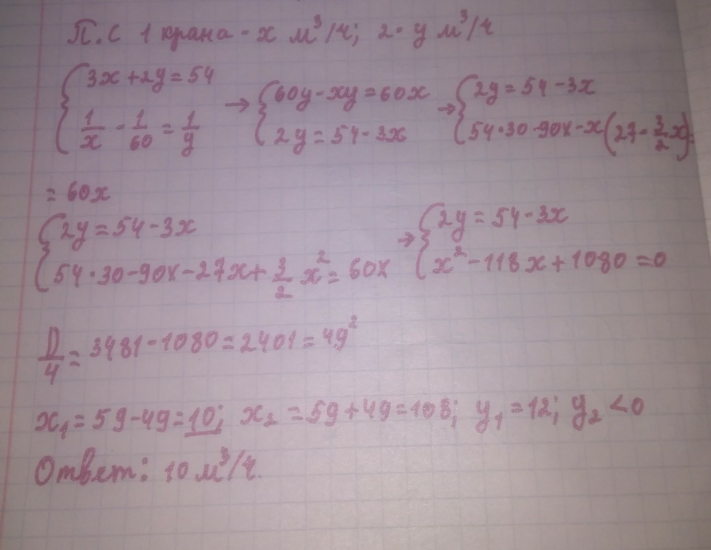 Аквариум объёмом 54 м³ заполняется при помощи двух кранов. При этом первый кран работает 3 ч., а второй - 2 ч. Какова пропускная способность первого крана, если 1 м³ он заполняет на 1 мин. медленнее, чем второй?