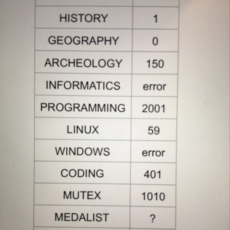 Программист Лара увлекается историей, Так что летом она поехала в археологическую экспедицию. Как-то раз при раскопках археологи обнаружили кусок барельефа со следующей таблицей, в которой словам ставились в соответствие числовые значения или значок со значением «ошибка».