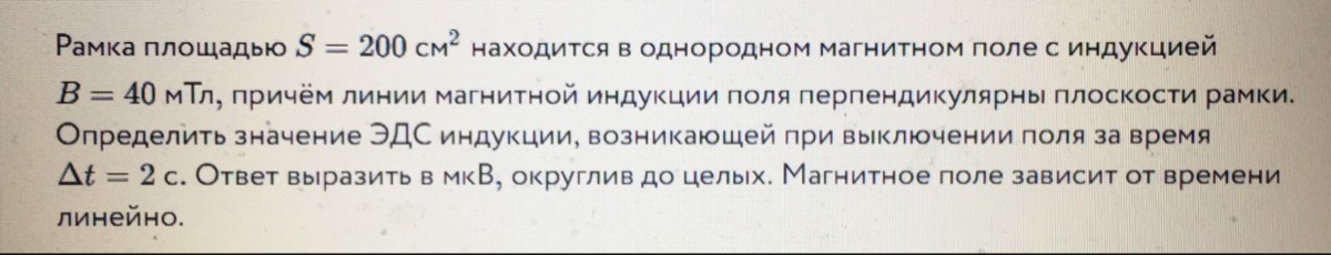 Эдс индукции E=-dФ(t)/dt, где Ф(t) - магнитный поток через рамку. До выключения поля через рамку проходил магнитный поток Ф=B*S=2*10⁻²*4*10⁻²=8*10⁻⁴ Вб. Так как по условию магнитный поток при отключении изменяется линейно относительно времени, то Ф(t)=Ф-a*t, где a=const - неизвестный пока коэффициент. Из условия Ф(2)=0 следует уравнение 8*10⁻⁴-2*a=0, откуда a=4*10⁻⁴. Отсюда Ф(t)=8*10⁻⁴-4*10⁻⁴*t и dФ/dt=-4*10⁻⁴ Вб/с. Тогда E=4*10⁻⁴ В=400 мкВ. Ответ: 400 мкВ.
