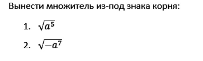 sqrt{a^5}=sqrt{a^4*a}=a^{2} sqrt{a} \sqrt{-a^7}=sqrt{-a*a^6} =a^3sqrt{-a}