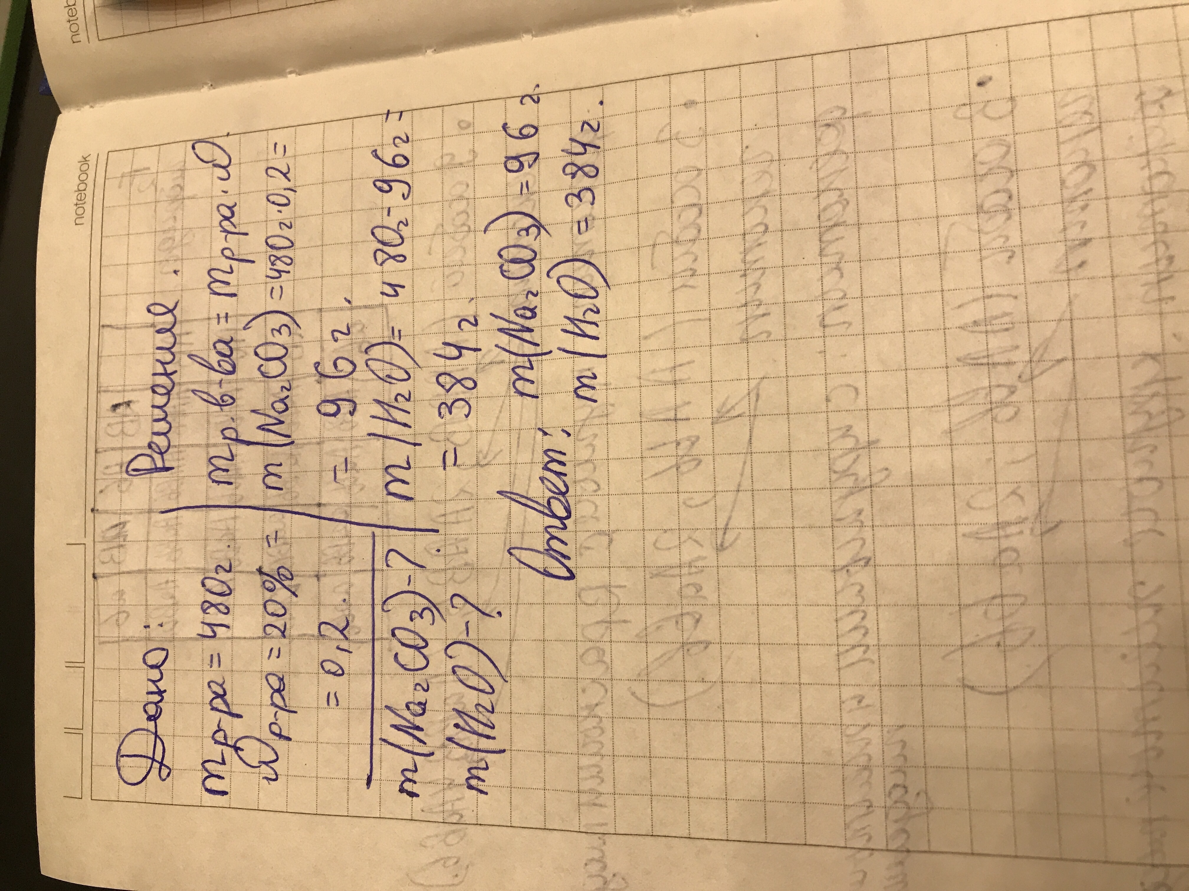 Помогите пожалуйста решить задачу по химии! Какова масса карбота натрия и какова масса воды в 480 громмов 20 % настойки карбоната натрия.