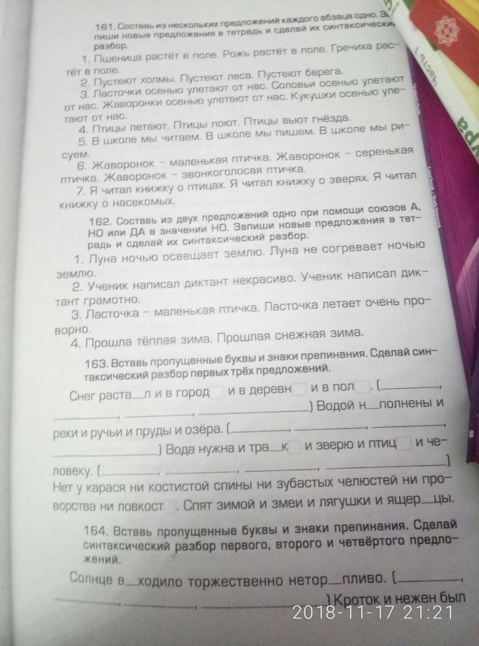 161. 1.рожь, пшеница, гречиха растут в поле.2 пустеют холмы,леса и берега. 3.ласточки, соловьи, жаворонки и кукушки осенью улетают от нас .4.Птицы летают, поют и Вьют гнезда.5.в школе мы читаем, пишем и рисуем.6. Жаворонок -маленькая, серенькая и звонкоголосная птичка.7.я читал книжку о птицах, о зверях и о насекомых