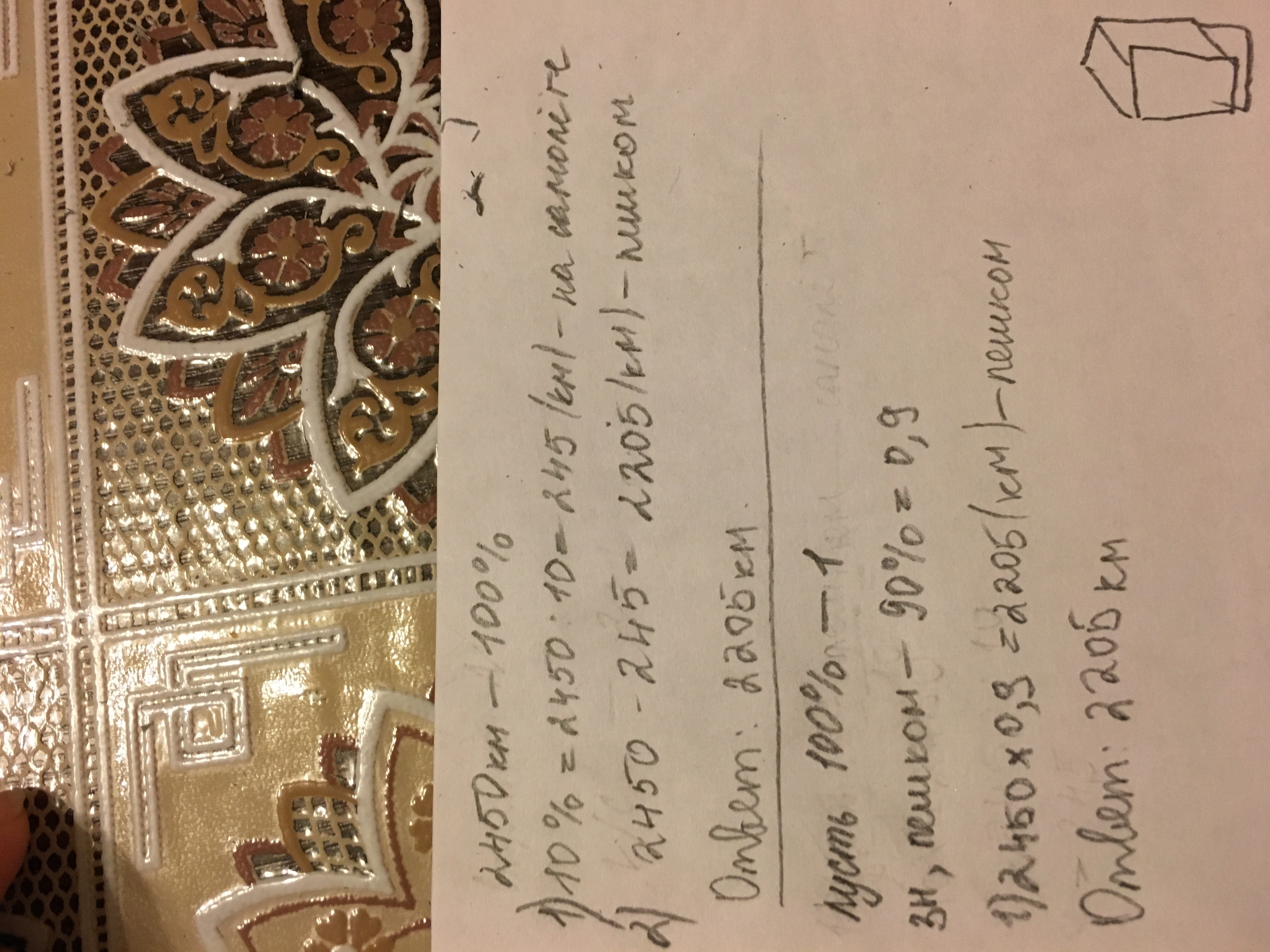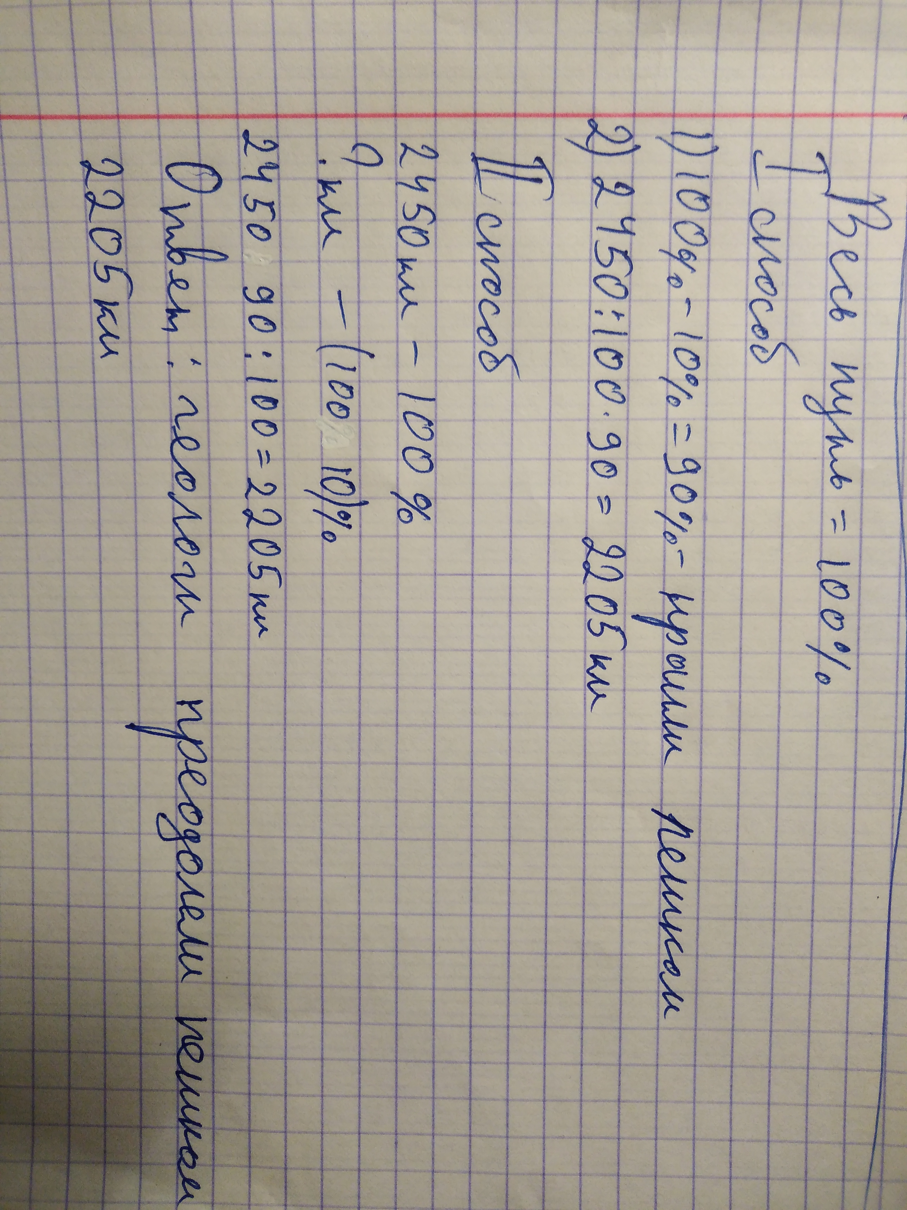 Геологи преодолели путь длиной в 2450 км. 10% пути они пролетели на самолете. Остальную часть пути они прошли пешком. Сколько километров геологи прошли пешком? (Решите задачу двумя способами).