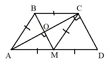 Рассмотрим BCDM: BC = MD (так как MD = 0.5AD по построению, BC = 0.5AD по условию), BC || MD ⇒ BCDM - параллелограмм ⇒ CD || BM ⇒ ∠AOM = ∠ACD = 90° как соответственные.