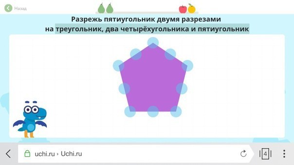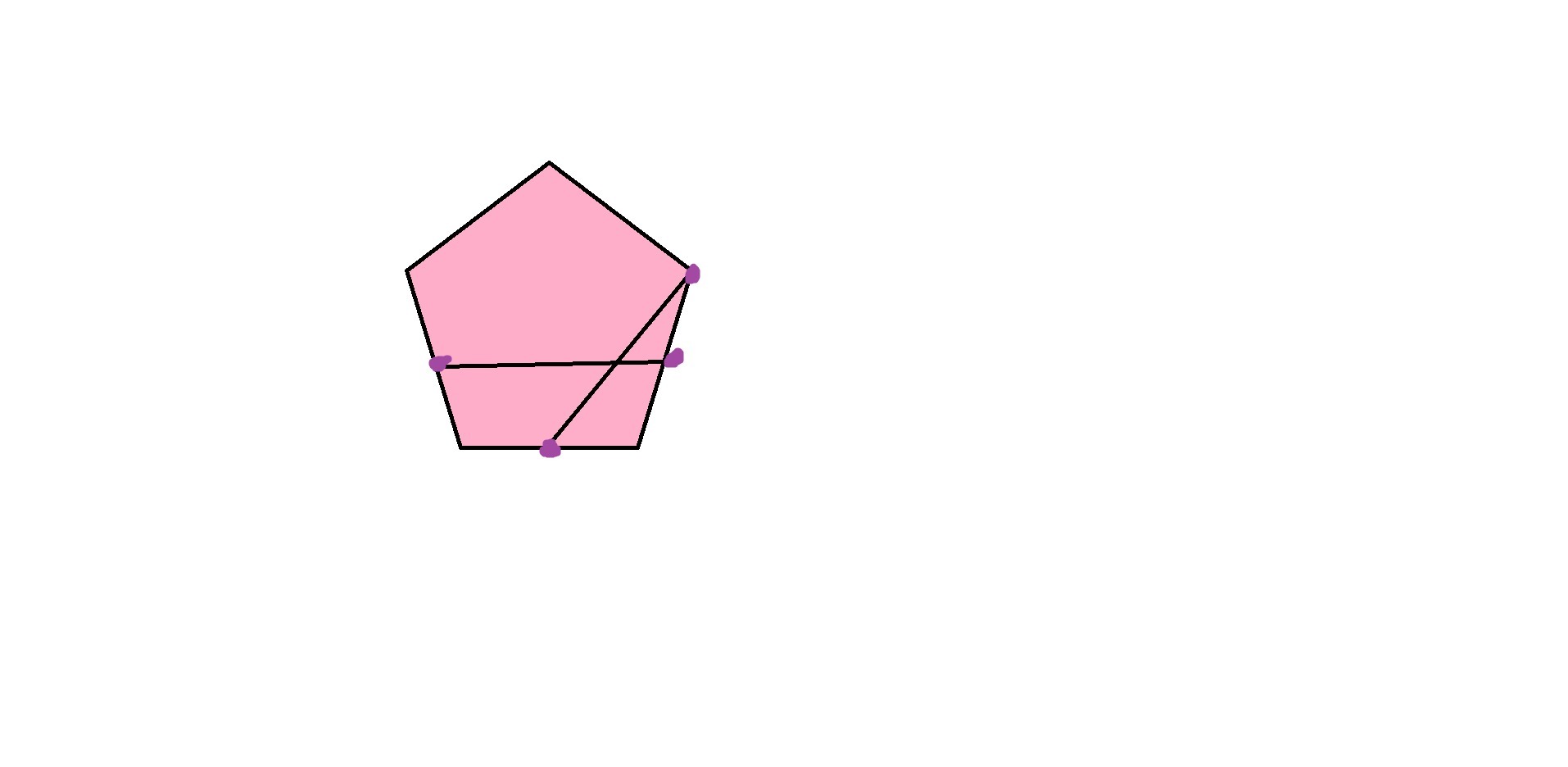 Задание: разрежь пятиугольник двумя линиями на 1 треугольник,2 четырехугольника,1 пятиугольник