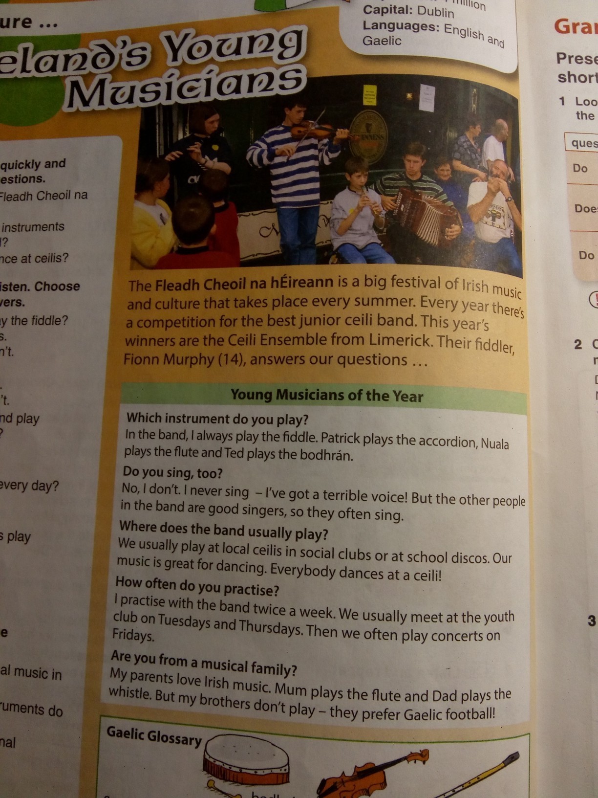 Молодые музыканты года Какой инструмент вы играете? В группе Ialways играют на скрипке. Патрик играет на аккордеоне, Нуана играет на флейте, а Тед играет на бодхане. Вы тоже поете? Нет, не знаю. Я никогда не пою - У меня ужасный голос! Но другие люди - хорошие певцы, поэтому они часто поют. Где обычно играет группа? Обычно мы играем в местных клубах в социальных клубах или на школьных дискотеках. музыка отлично подходит для танцев. Все танцуют на потолке! Как часто вы практикуете? Я тренируюсь с группой два раза в неделю. Обычно мы встречаемся в молодежном клубе по вторникам и четвергам. Затем мы часто играем на концертах по пятницам. Вы из музыкальной семьи? Мои родители любят ирландскую музыку. Мама играет на флейте, а папа играет в свист. Но мои братья не играют - они предпочитают, чтобы Gaelic foo показывал