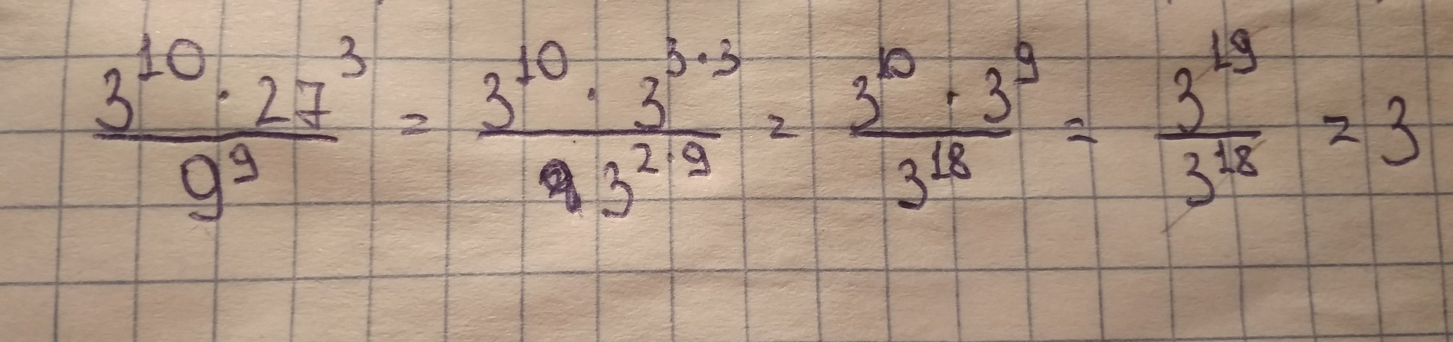 Готовлюсь к К.Р. , но не могу никак вычислить...3^10 * 27^3 _ черта дроби 9^9.