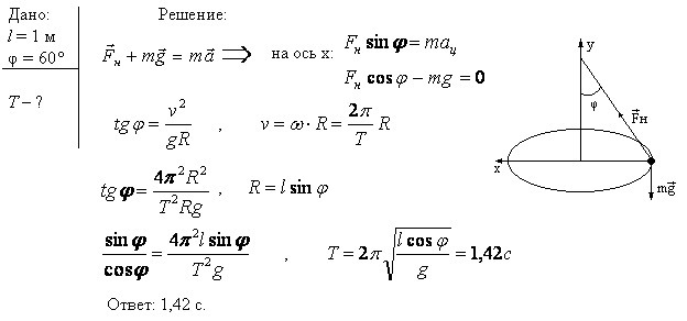 υ=2πR/T (длна нити по теореме Пифагора l=R/sinα)