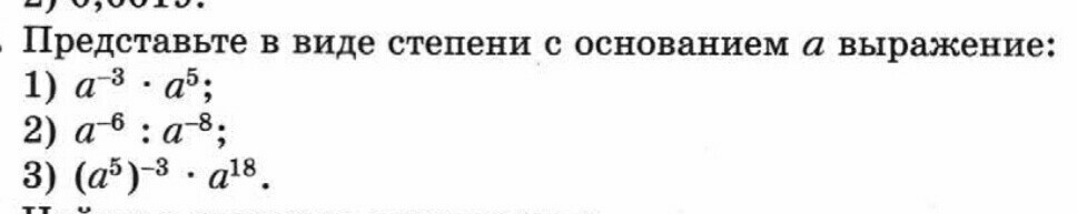 1).a^-3*a^5=a^(-3+5)=a^2; 2). a^-6:a^-8=a^(-6-(-8))=a^(-6+8)=a^2; 3). (a^5)^-3*a^18=a^-15*a^18=a^3. ^-это степень.