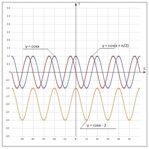Чтобы построить оба графика, сначала построим график функции y = cosx (синий график), а затем воспользуемся параллельным переносом.
