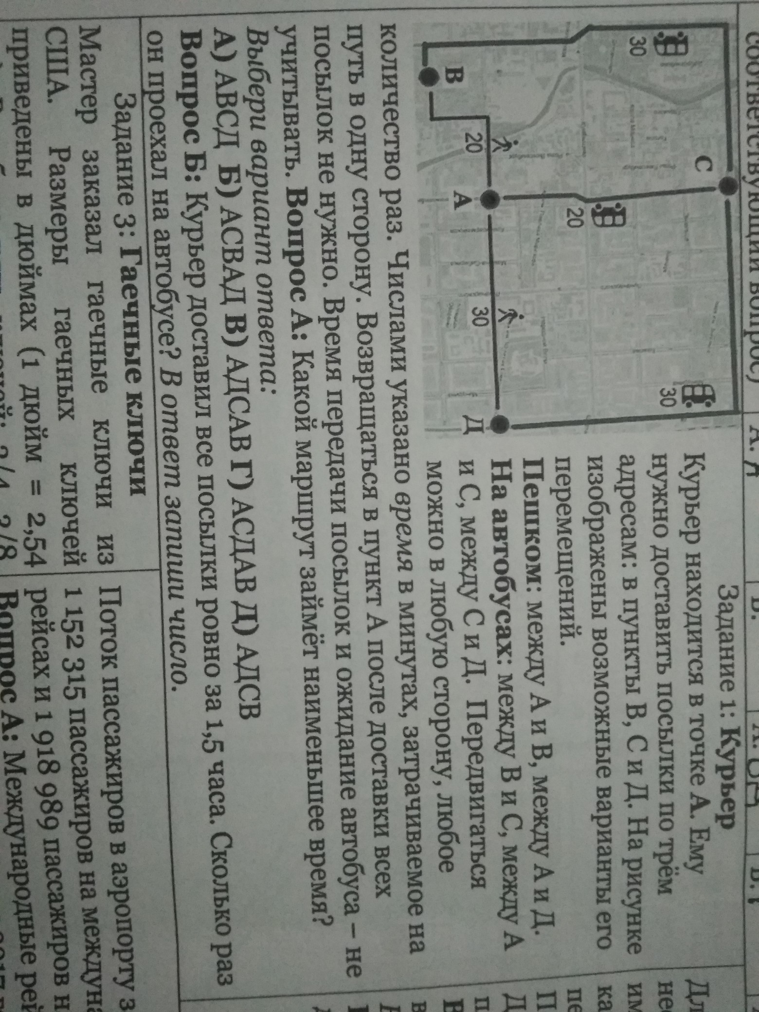 На автобусах: между В и С, между А и С, между С и Д. Передвигаться можно в любую сторону, любое количество раз. Числами указано время в минутах, затрачиваемое на путь в одну сторону. Возвращаться в пункт А после доставки всех посылок не нужно. Время передачи посылок и ожидания автобуса не учитывать. Нужен только вопрос Б.