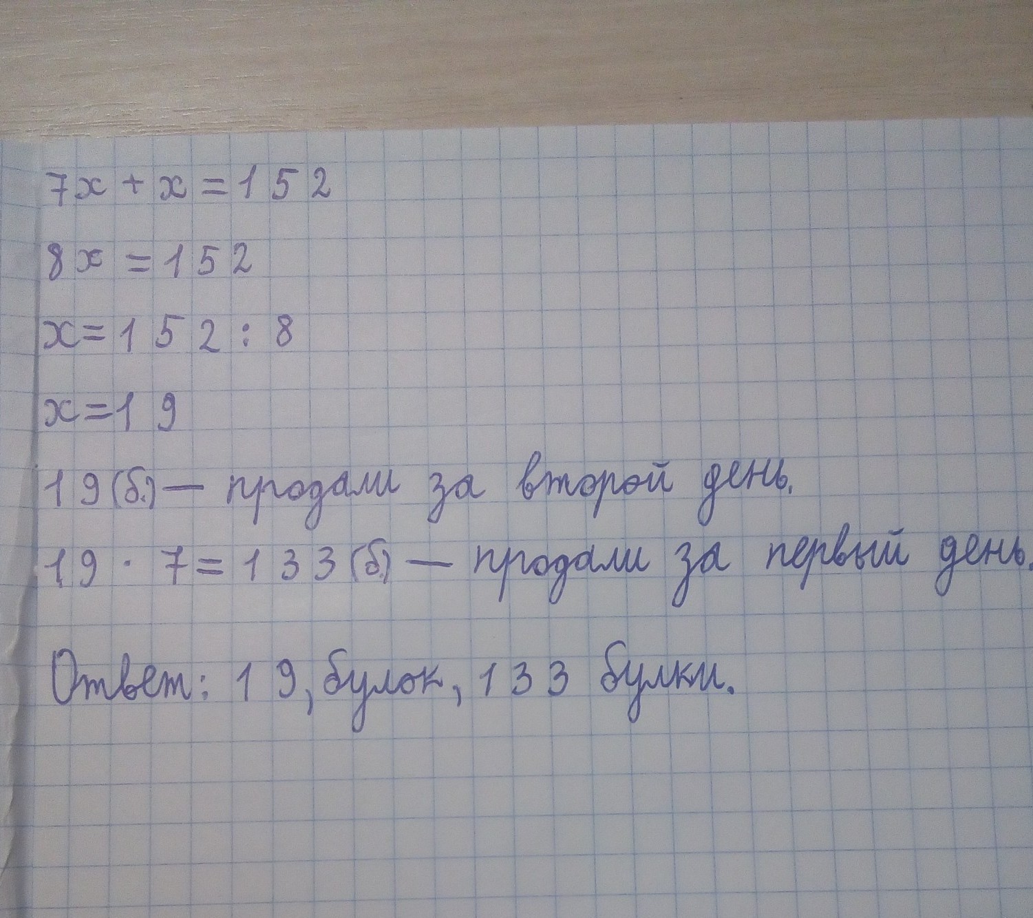 Зная, что за два дня продали 152 булки хлеба, составим и решим уравнение.