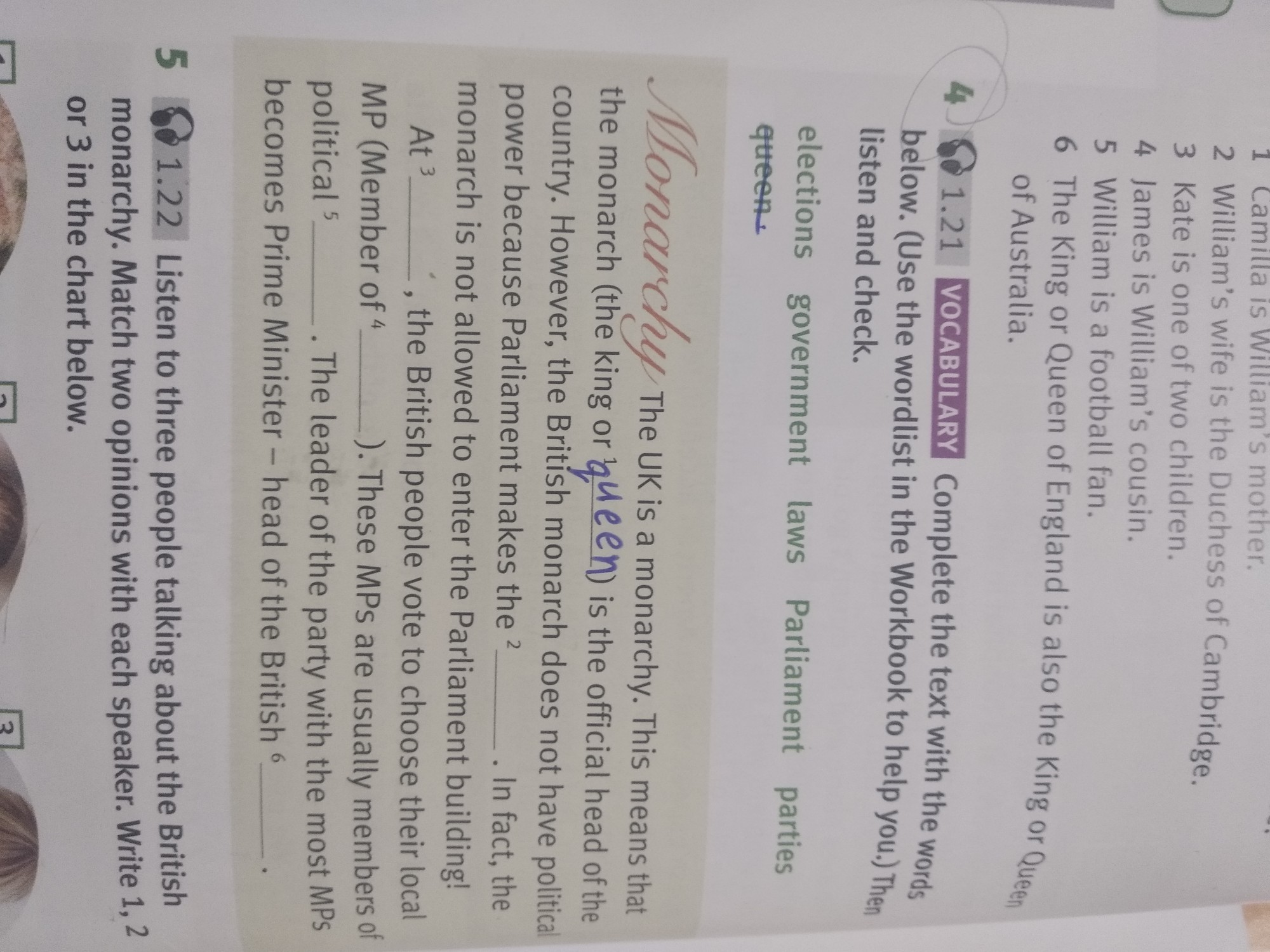 1 queen 2 laws 3 elections 4 Parliament 5 parties 6 government