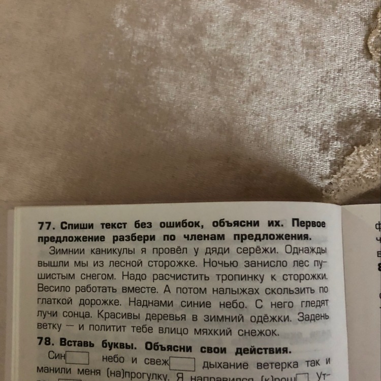 Зимние каникулы я провел у дяди Серёжи. Однажды вышли мы из лесной сторожки. Ночью занесло лес пушистым снегом. Надо расчистить тропинку к сторожке. Весело работать вместе. А потом на лыжах скользить по гладкой дорожке. Над нами синее небо. С него глядят лучи солнца. Красивы деревья в зимней одёжке. Задень ветку - и полетит тебе в лицо мягкий снежок.