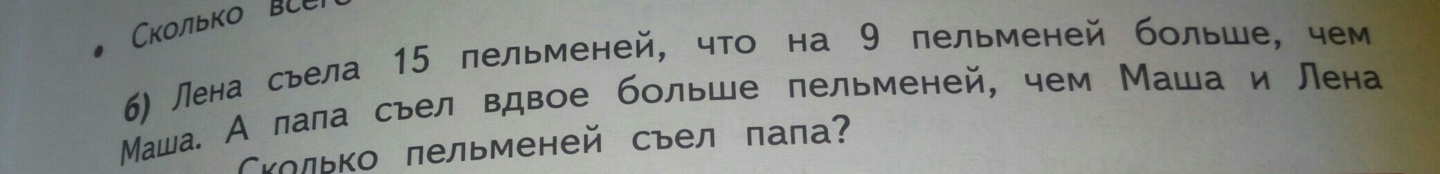 Лена съела 15 пельменей что на 9 пельменей больше чем Маша а папа съел 2 и больше пельменей чем Маша и Лена вместе Сколько пельменей съел папа