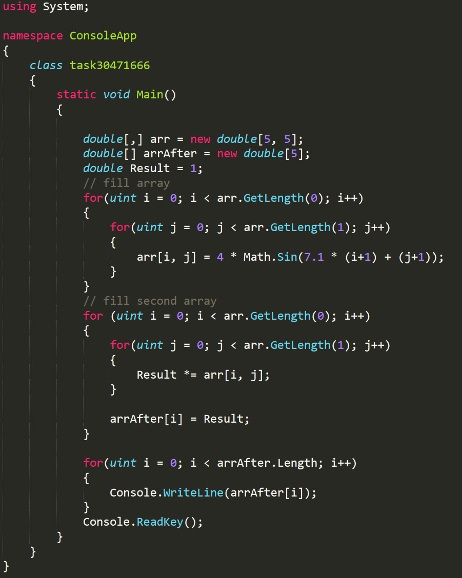Матрицу A(5,5) задать по формуле A[i,j] = 4sin(7.1i+j). Найти новый одномерный массив C из произведений элементов каждой строки матрицы A.