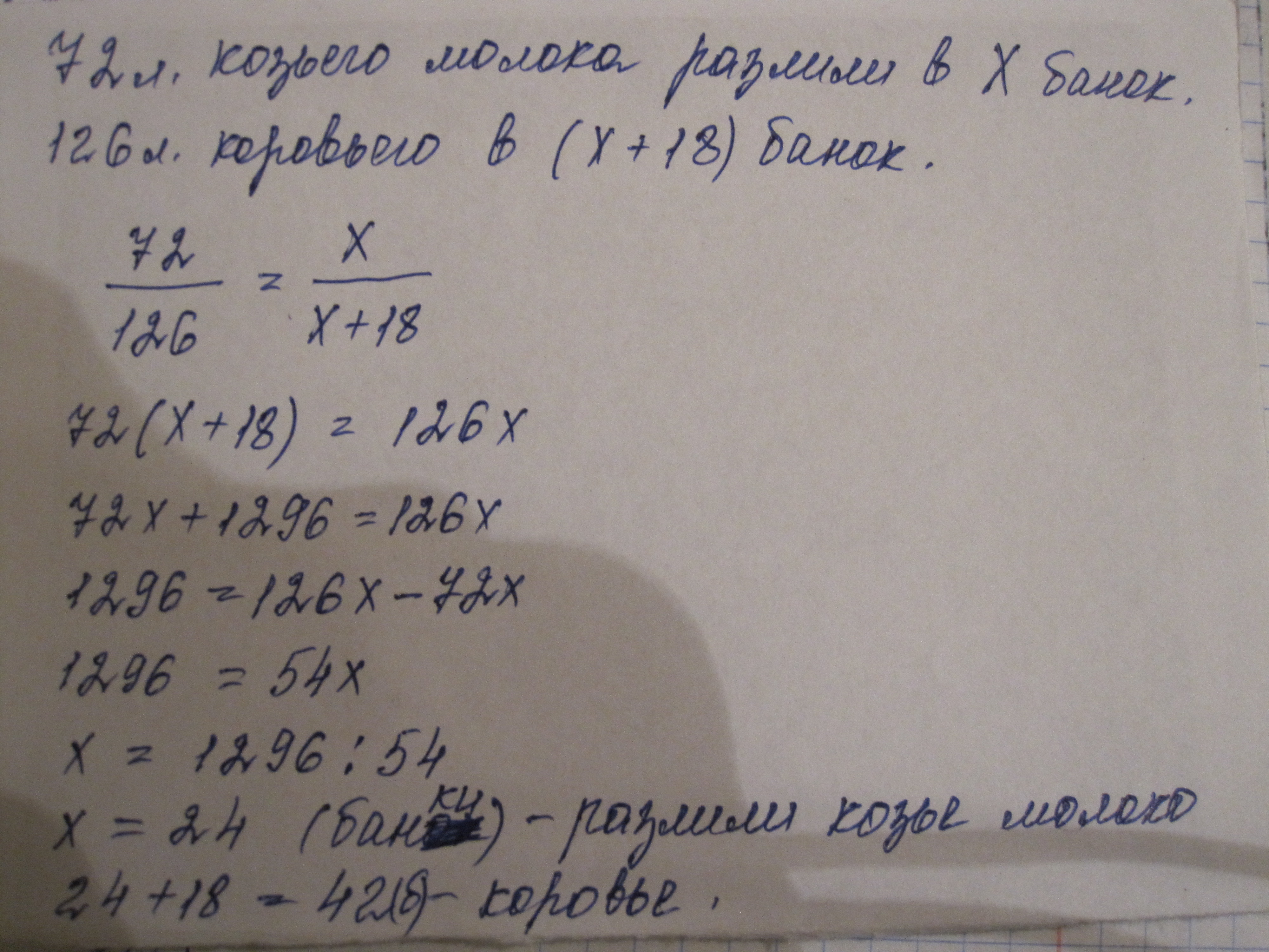 ПОМОГИТЕ БУДЬ ЛАСКА !!!!!ДЯКУЮ!!!! На фермі 126 л коров'ячого і 72 л козячого молока розлили в однакові банки.Банок з коров'ячим молоком було на 18 більше. ніж з козячим.Скільки наповнили тих та інших банок