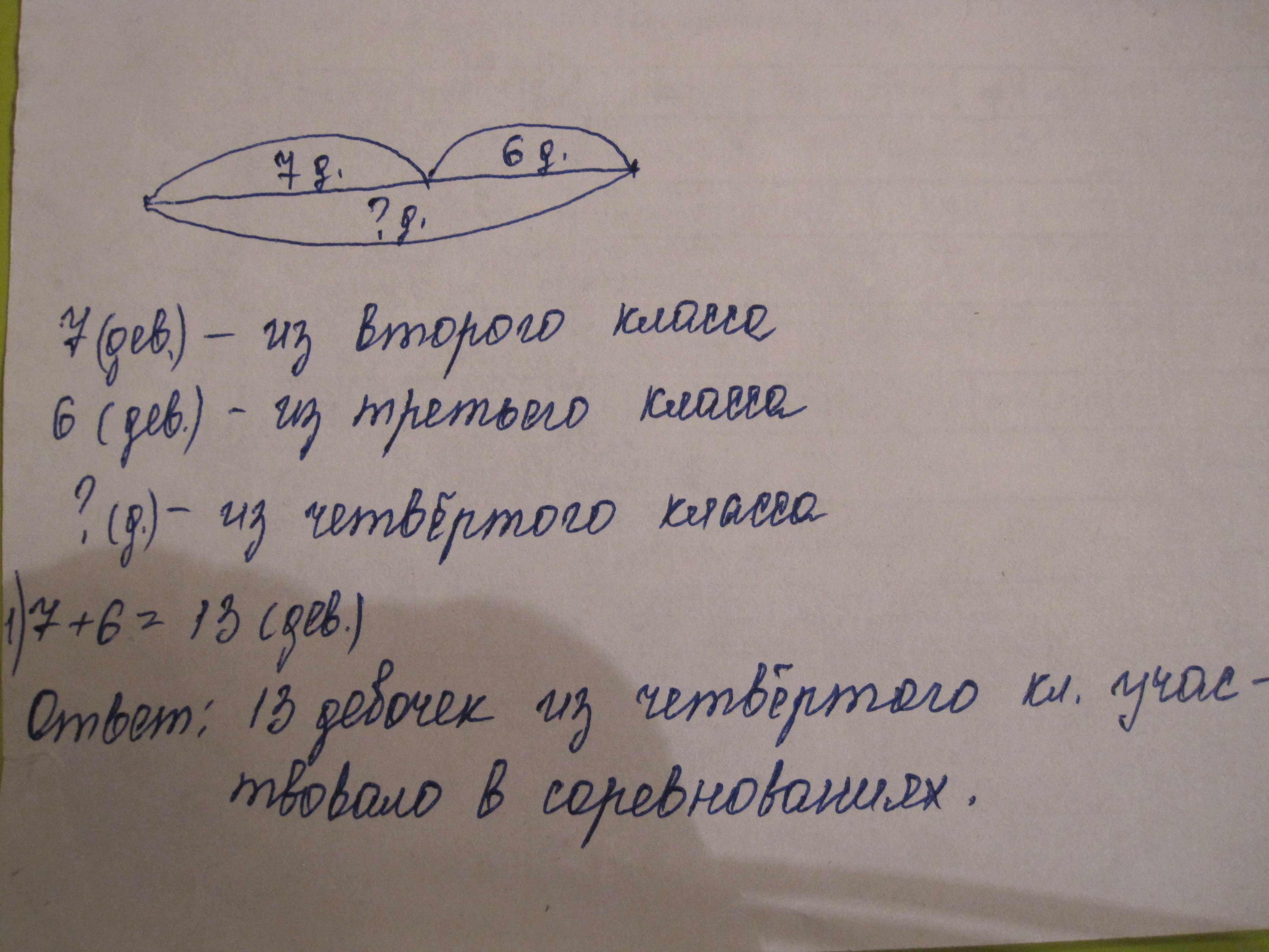 В соревнованиях на уроке физической культуры участвовали 7девочек из второго класса и 6девочек из третьего,а из четвёртого учасивоволо столько,сколько из второго и третьего вместе.Сколько девочек из четвёртого класса участвовало в соревнованиях?