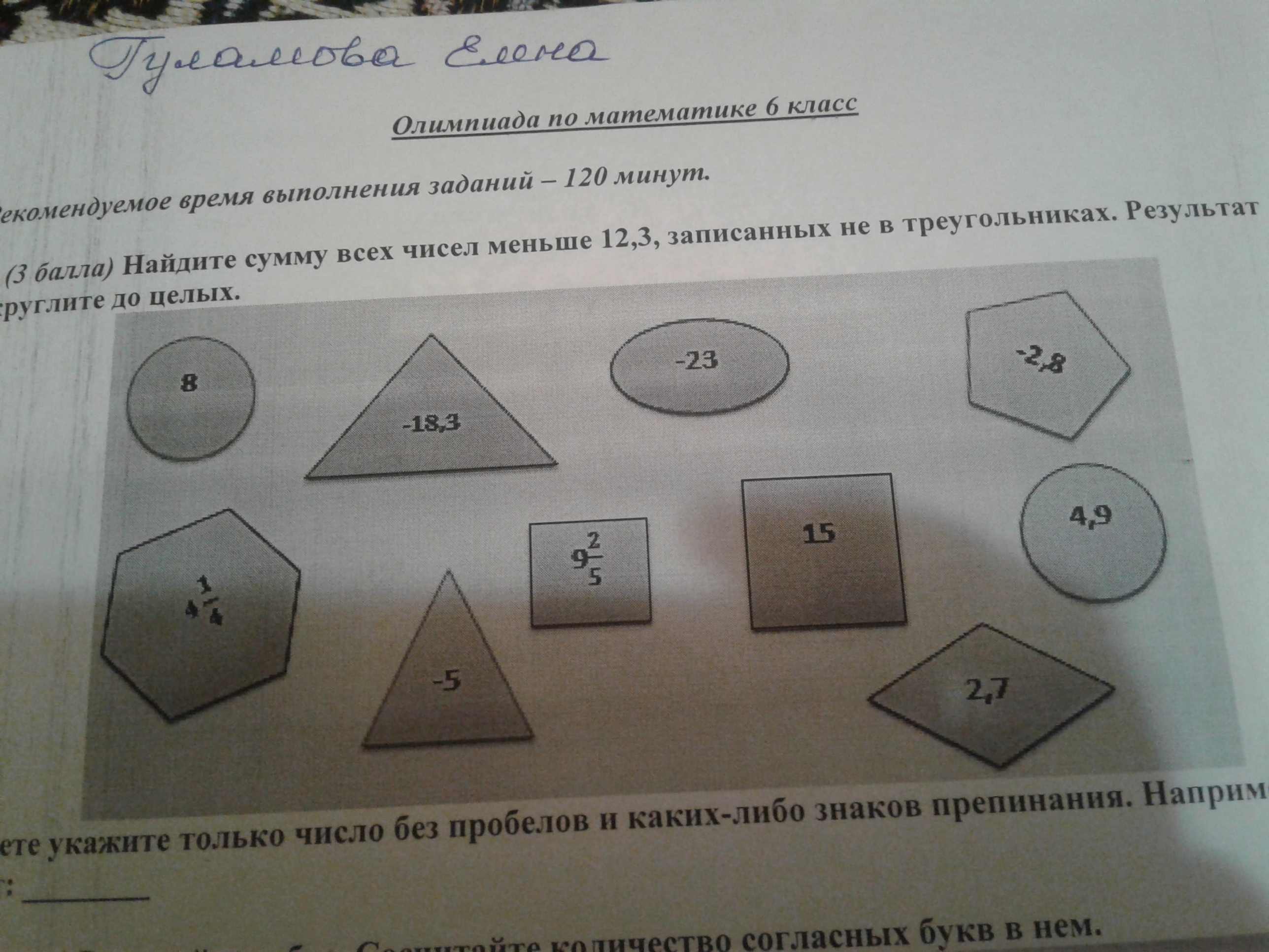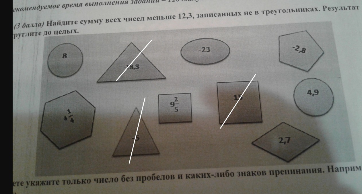 8 + 4 1/4 + 9 2/5 + (-23) + 2,7 +4,9 + (-2,8) = 12,25 + 9,4 - 23 + 2,7 + 4,9 - 2,8 = 3,45