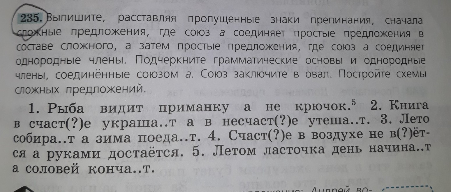 5)Летом ласточка день начинает, а соловей кончает. [- = ], a [-=]. Гр.основа (ласточка начинает;вторая - соловей кончает)